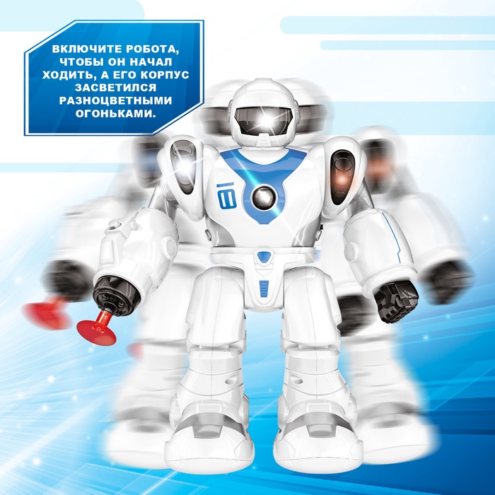 - При включении робот начинает ходить, а его корпус светиться огоньками.