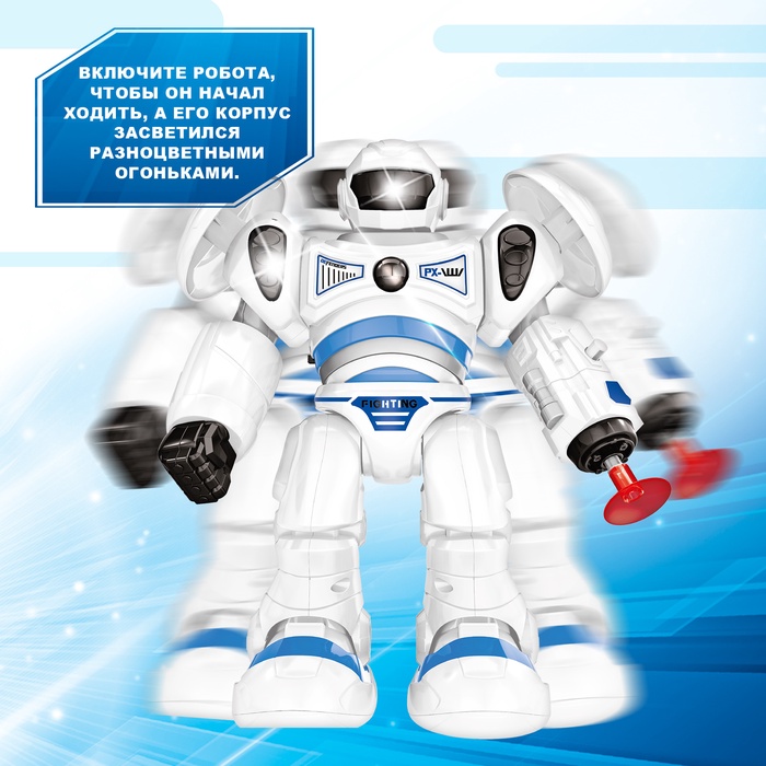 - При включении робот начинает ходить, а его корпус светиться огоньками.