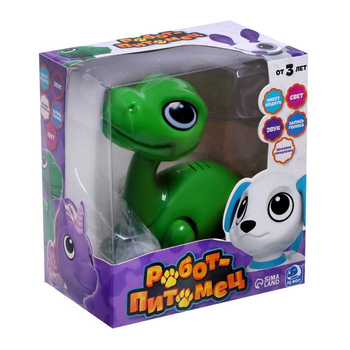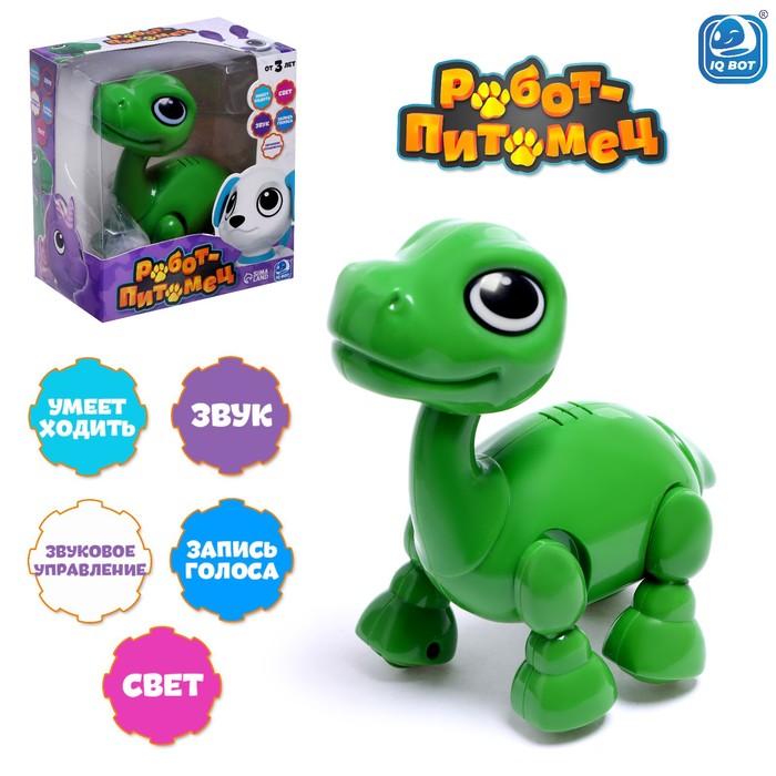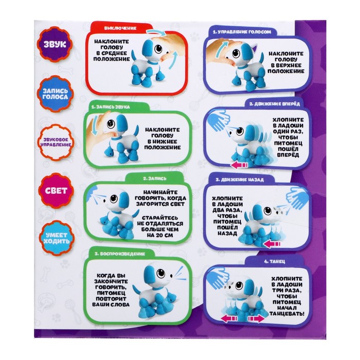 Игрушка оснащена звуковыми датчиками. Питомцем можно управлять с помощью звуков: