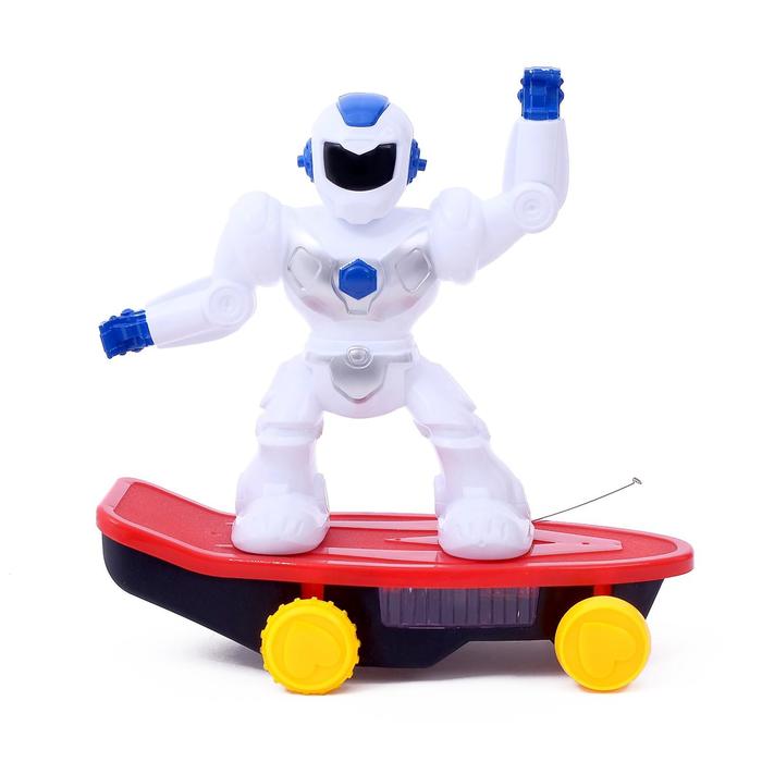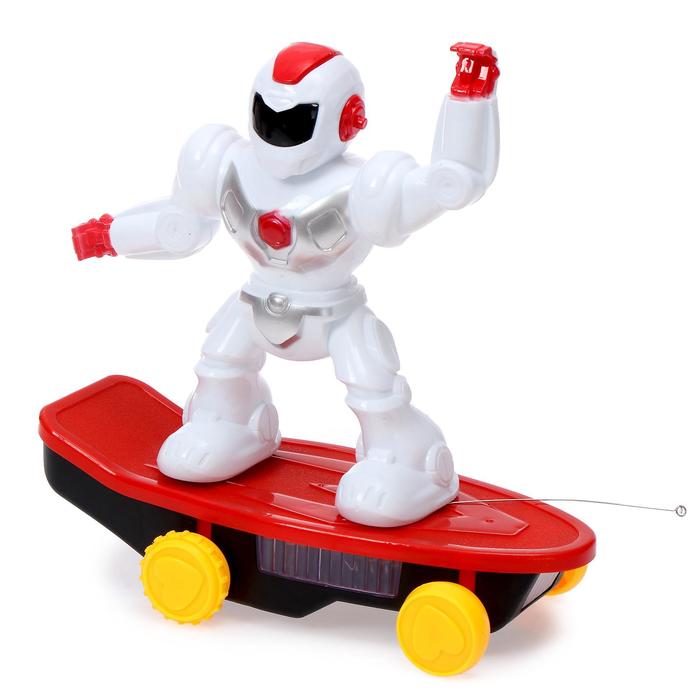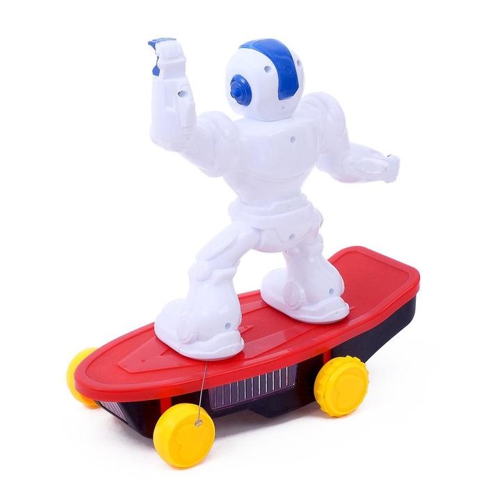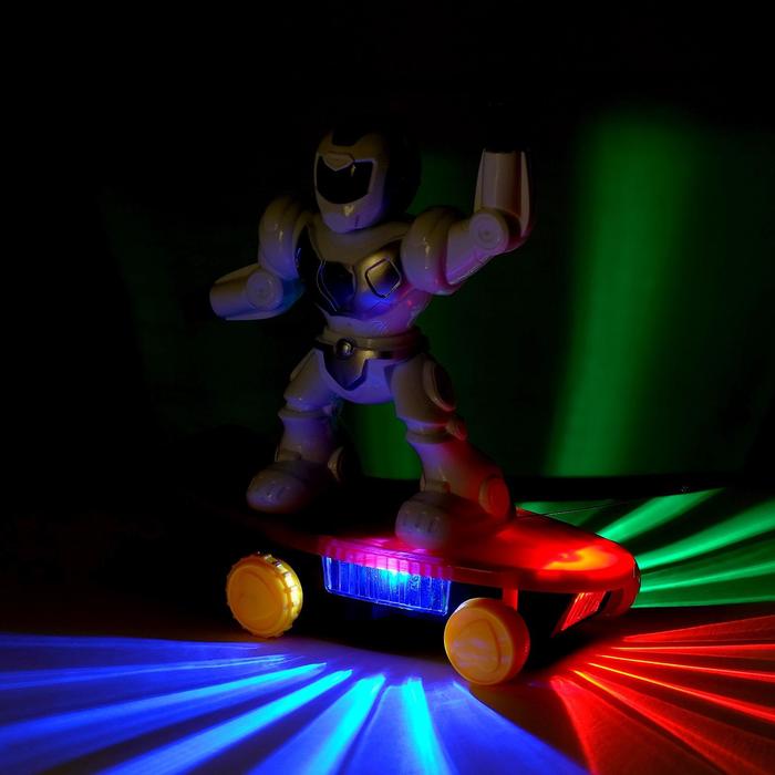 Робот передвигается вперёд, назад, влево и вправо. Играйте с ним в темноте, в него встроены красочные лампочки. «Скейтбордист» не только катается на доске в любую сторону, но и ловко исполняет на ней трюки!