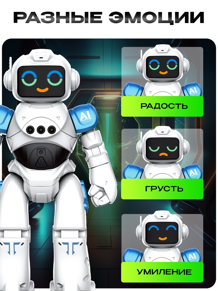 - Меняет эмоции – экран лица отображает разные выражения.