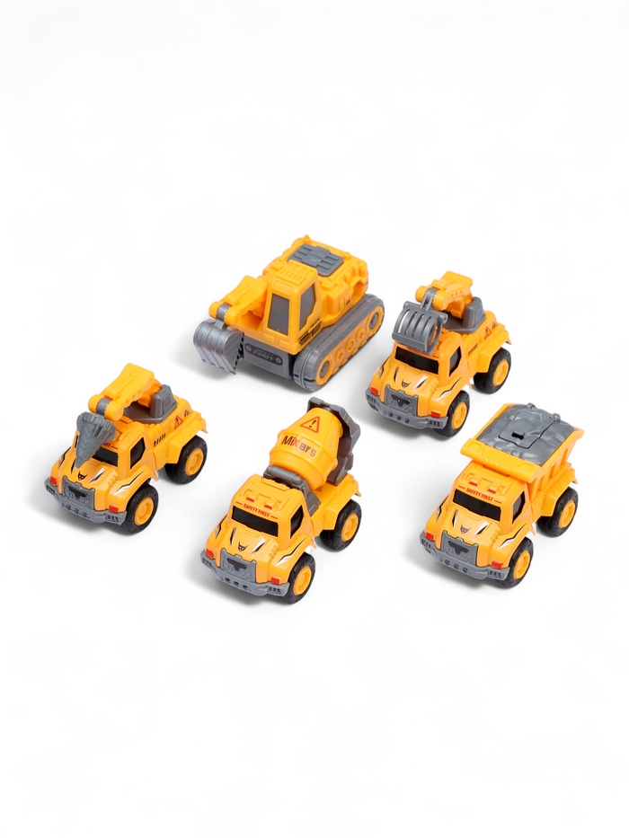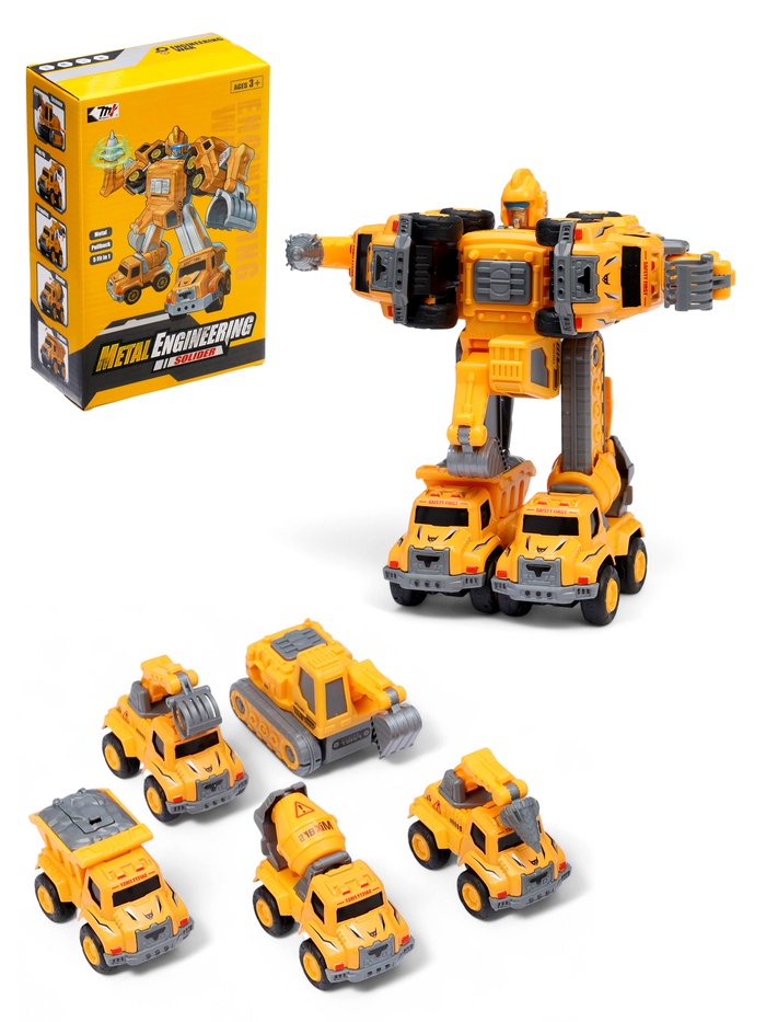 - 5 профессиональных машин в одном наборе: из деталей собирается бульдозер, подъёмный кран, бетономешалка и другие строительные машины, которые затем объединяются в крупного робота. Все модели подвижны — колёса крутятся, стрелы крана поднимаются.