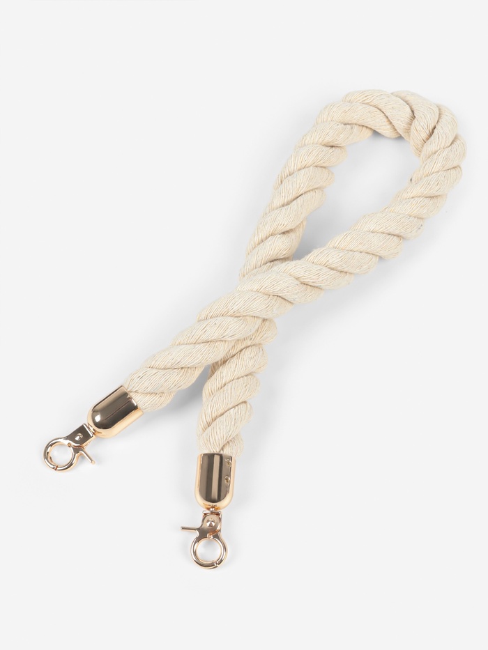 Короткий канатный ремешок с золотистыми карабинами — элегантное решение для компактных сумок. Плотная плетеная структура из полиэстера в кремовом оттенке сочетает легкость и прочность. Длина 60 см идеальна для ношения в руке или на сгибе локтя.