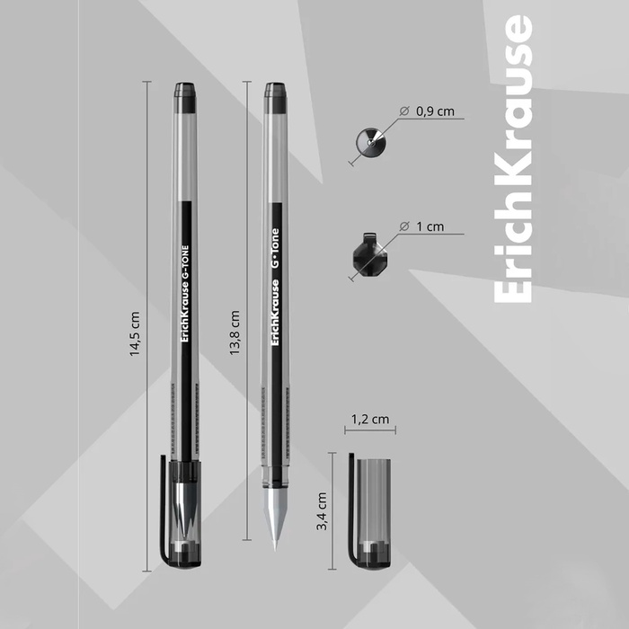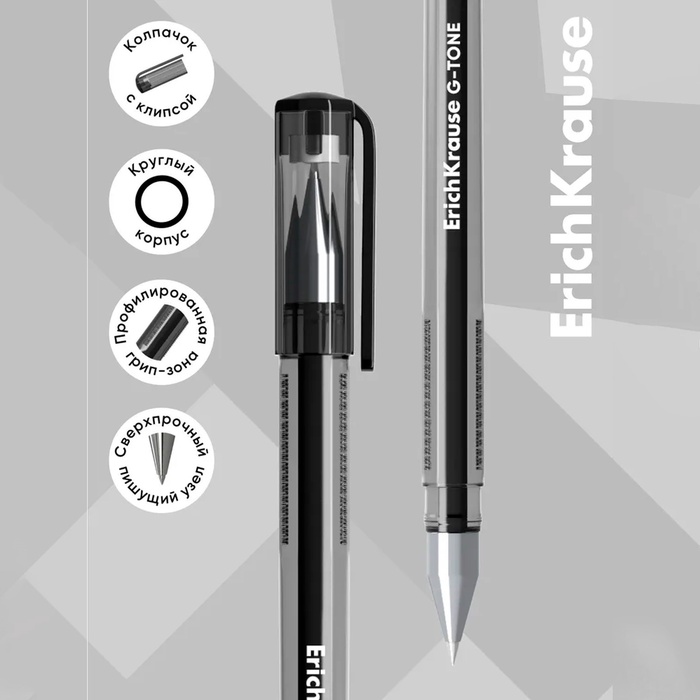 - Неавтоматическая гелевая ручка с чёрным стержнем и защитным колпачком.