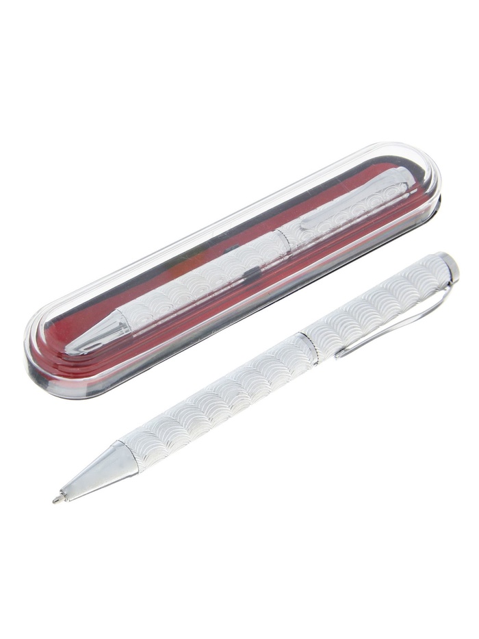 Эта шариковая ручка с лаконичным серебристым корпусом — выбор для тех, кто предпочитает ясность и функциональность. Её сдержанный металлический блеск сочетается с любой обстановкой, от рабочего кабинета до конференц-зала. Поворотный механизм и футляр делают её практичным и всегда готовым к использованию инструментом для записей и подписей.