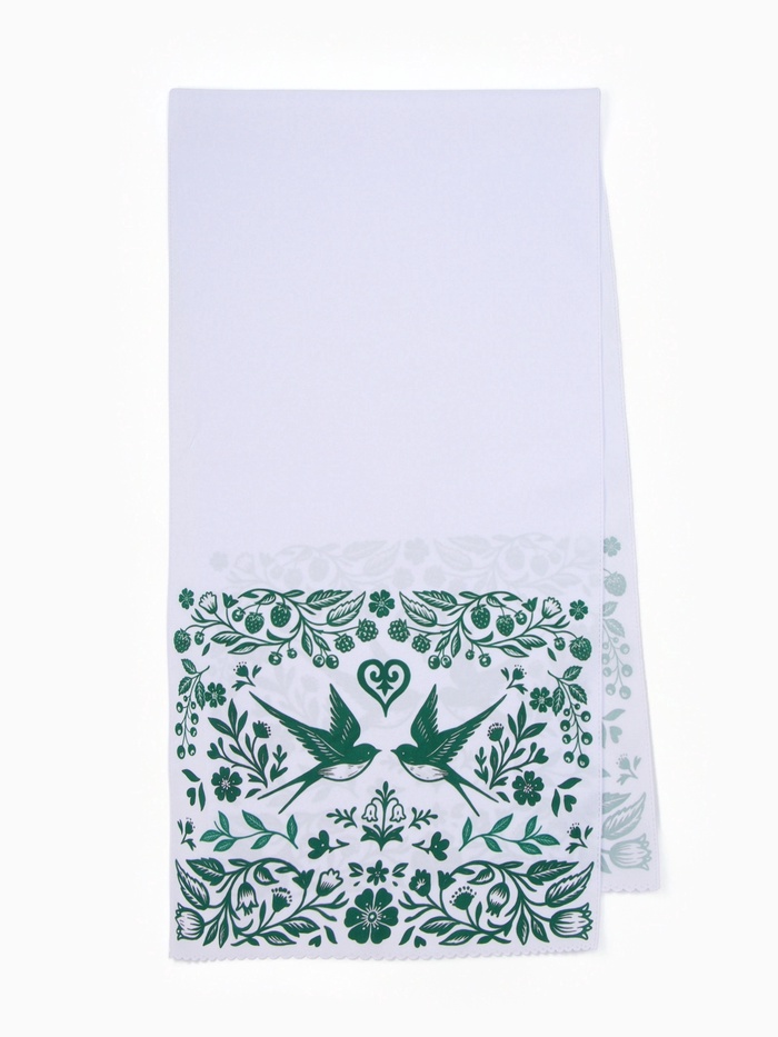 Свадебный рушник с ласточками и зелёным орнаментом — символ начала новой жизни, наполненной ростом, гармонией и верностью. Белый фон отражает чистоту чувств, а зелёные узоры и птицы — признак весны, обновления и домашнего уюта. Такой рушник подчеркнёт значимость свадебного или венчального обряда и станет бережно хранимым напоминанием о самом важном дне в жизни молодожёнов.