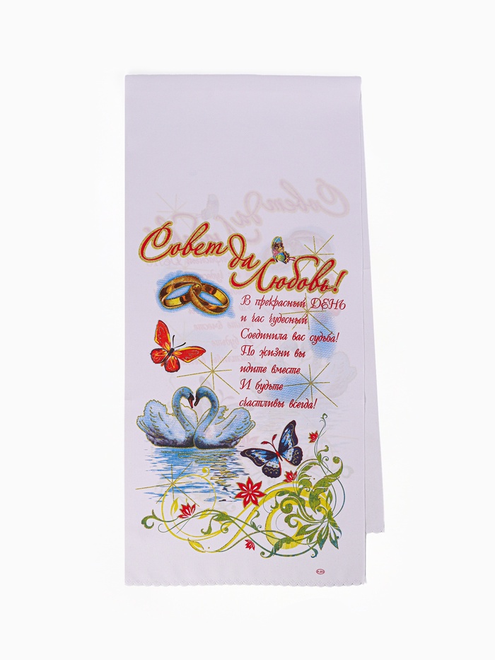 Рушник под ноги. Кто первым из молодых на него встанет — тому и быть хозяином в доме. Лучше отказаться от вариантов, на которых изображена пара голубей или лебедей, а также кольца. Считается, что супруги могут затоптать своё счастье. Лучше отдать предпочтение геометрическим или растительным узорам.