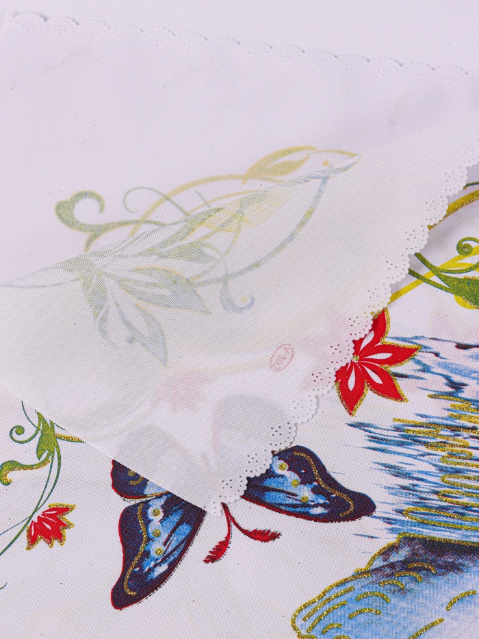 Хлебосольный. На него кладут каравай и встречают молодожёнов после ЗАГСа. Орнамент может быть самый разный: голуби или лебеди, растительные орнаменты, свадебные кольца, деревья.
