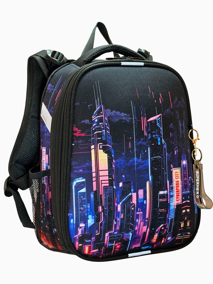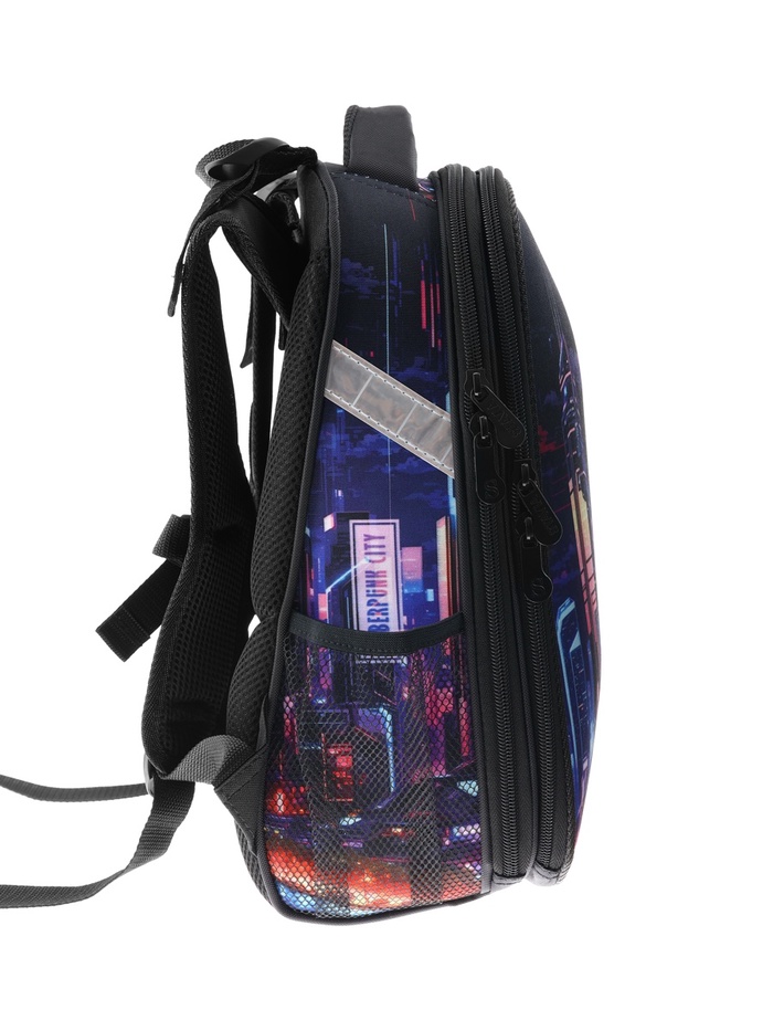 Ранец изготовлен из формованного EVA-материала и высокопрочного непромокаемого полиэстера. Размер 30 х 38 х 16 см. Вес 900 г. Прочные формованные стенки и дно ранца позволяют надежно защитить содержимое от влаги, загрязнений и предотвращают его замятие. Ранец с двумя вместительными отделениями, закрывающимися на реверсивную пластиковую молнию с металлическими «бегунками»; в первом — «плавающие» перегородки для тетрадей и учебников, во втором – большой карман из сетки и карманы-органайзеры для канцелярских принадлежностей