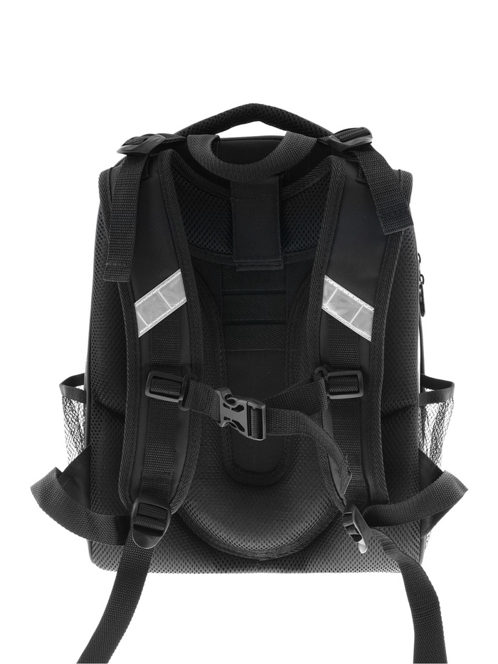 Плотная спинка с анатомическими элементами дополнительно укреплена пластиком, сверху – дышащая трехслойная сетка. Лямки-маечка плотные, мягкие. Регулируются по длине и высоте, что позволяет без труда отрегулировать их по росту ребенка. Ранец снабжен надежным нагрудным фиксатором и двумя боковыми карманами из прочной сетки. Есть удобная мягкая ручка для переноски и дополнительная петлевая ручка для размещения ранца на крюке