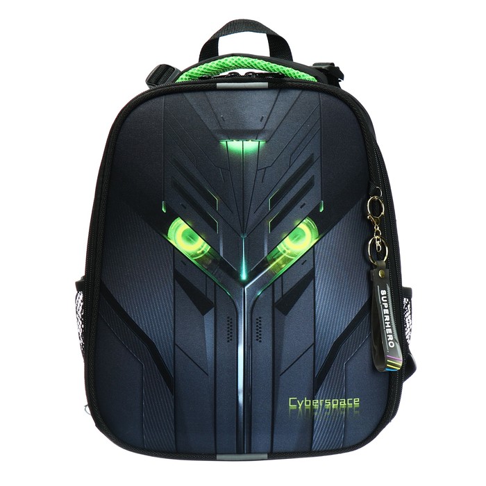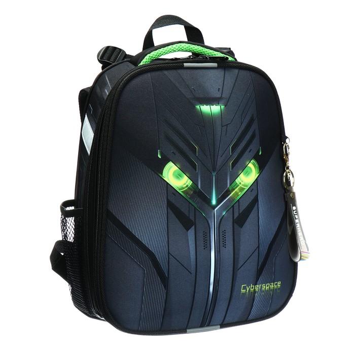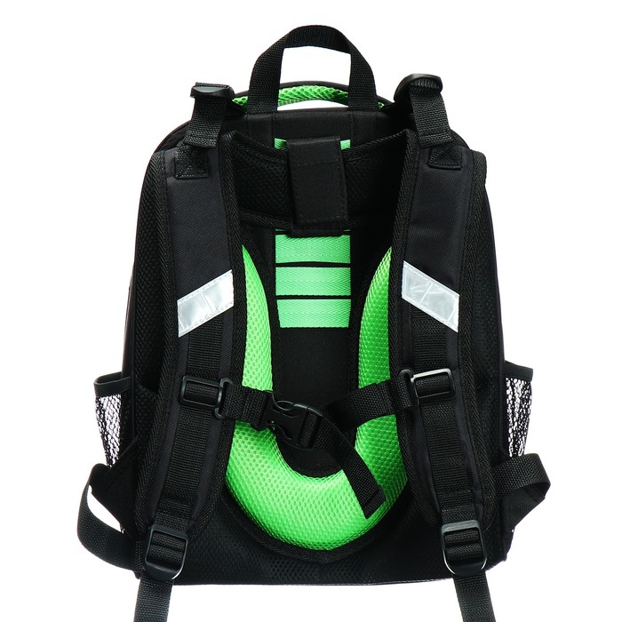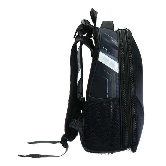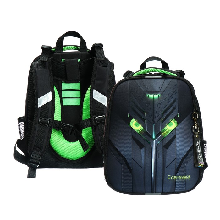 Ранец из формованного EVA-материала и высокопрочного непромокаемого полиэстера. Два вместительных отделения на реверсивной пластиковой молнии; в первом — «плавающие» перегородки для тетрадей и учебников, во втором – большой карман из сетки и карманы-органайзеры. Спинка с анатомическими элементами дополнительно укреплена пластиком, сверху – дышащая трехслойная сетка. Лямки-маечка плотные, мягкие. Регулируются по длине и высоте. Ранец снабжен нагрудным фиксатором и двумя боковыми карманами из прочной сетки. Есть мягкая ручка для переноски и дополнительная петлевая ручка для размещения ранца на крюке. На дне две пластиковые ножки. Ранец имеет светоотражающие элементы на лямках и корпусе. Брелок в комплекте.