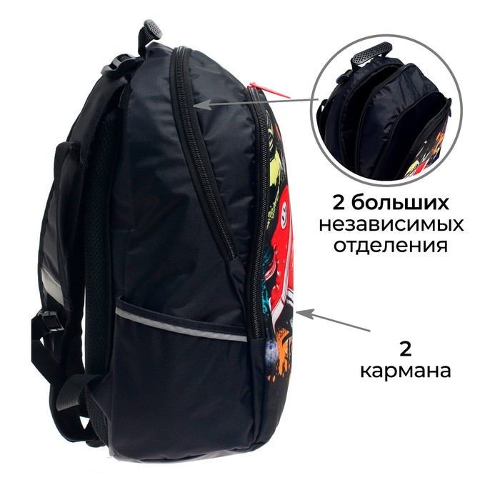Ученический рюкзак для младшего школьного возраста предназначен для переноски личных вещей и школьных принадлежностей. Верх изделия выполнен из прочного водоотталкивающего материала с покрытием ПВХ. Отдельные элементы оформлены оригинальной печатью. Внутренняя поверхность изготовлена из цветной подкладочной ткани, соответствующей дизайну.