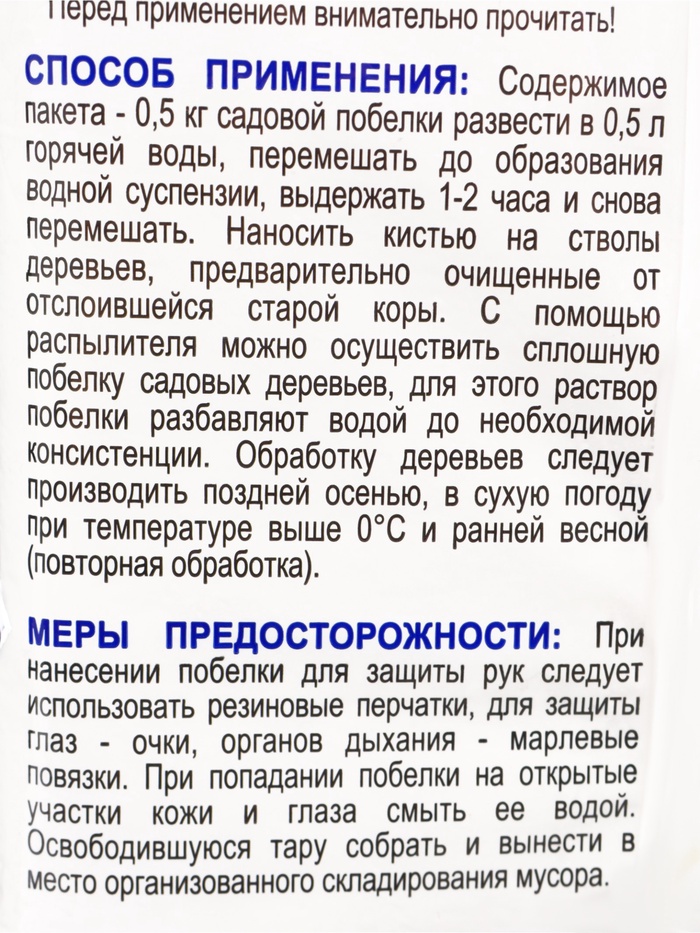 Содержимое пакета 0,5 кг садовой побелки развести в 0,5 л горячей воды, перемешать до образования водной суспензии, выдержать 1-2 часа и снова перемешать. Наносить кистью на стволы деревьев, предварительно очищенные от отслоившейся старой коры. С помощью распылителя можно осуществлять сплошную побелку садовых деревьев, для этого раствор побелки разбавляют водой до необходимой консистенции.