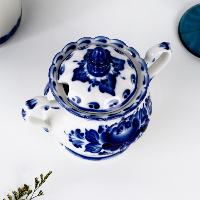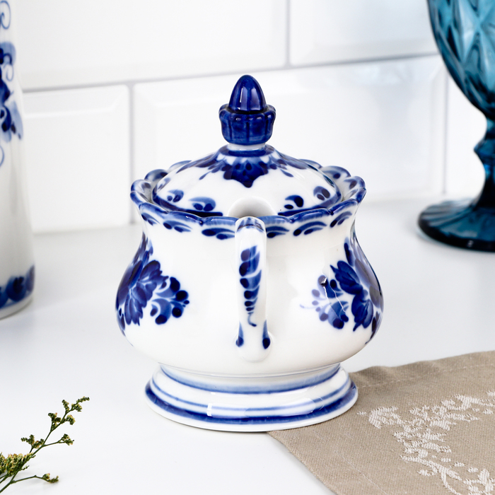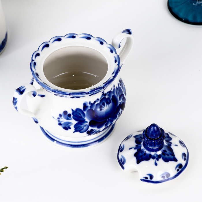 Традиции русского фарфора обретают современное звучание в этом изысканном предмете сервировки. Сахарница с изящным названием «Елена» – воплощение классического гжельского стиля, где каждая деталь продумана до мелочей.
