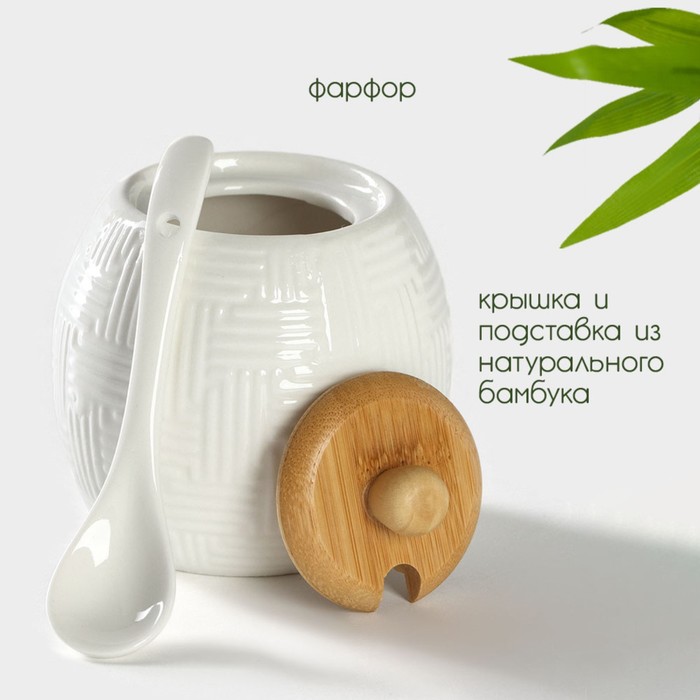 Сахарница BellaTenero изготовлена из качественного фарфора. Кухонные изделия из фарфора отличаются прочностью и надёжностью, устойчивы к появлению царапин и резким перепадам температур. Благодаря оригинальному дизайну и причудливым формам сахарница с ложкой отлично впишется в интерьер вашей кухни и станет настоящей изюминкой при сервировке.
