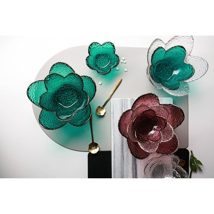 Посуда из стекла серии «Цветочный сад» имеет красивый рельеф и золотую отводку по краю. Изделия в форме распустившихся бутонов выполнены в изумрудном, голубом, розовом оттенках. Глубокие тарелочки разного объёма предназначены для салатов, закусок, десертов, густых соусов. Ёмкости сделают подачу интересной, они обязательно запомнятся вашим гостям!