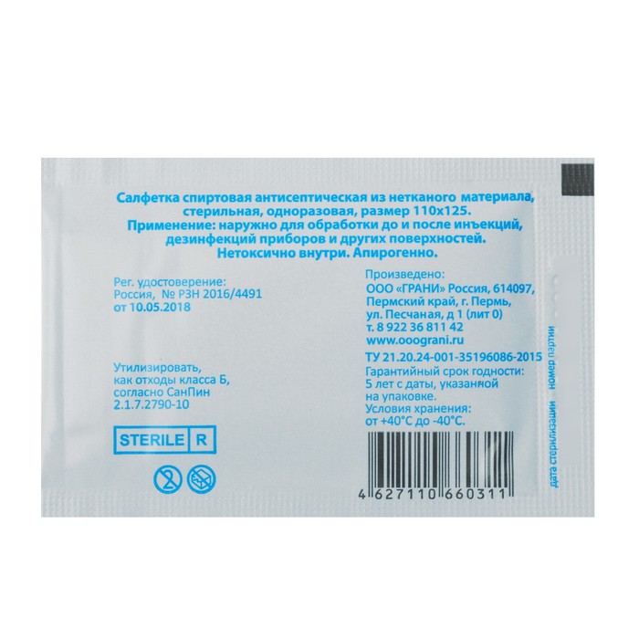 Благодаря пропитке 70-процентным раствором этилового спирта указанная салфетка, кроме антисептических свойств, обладает также сильным противомикробным/антибактериальным эффектом.