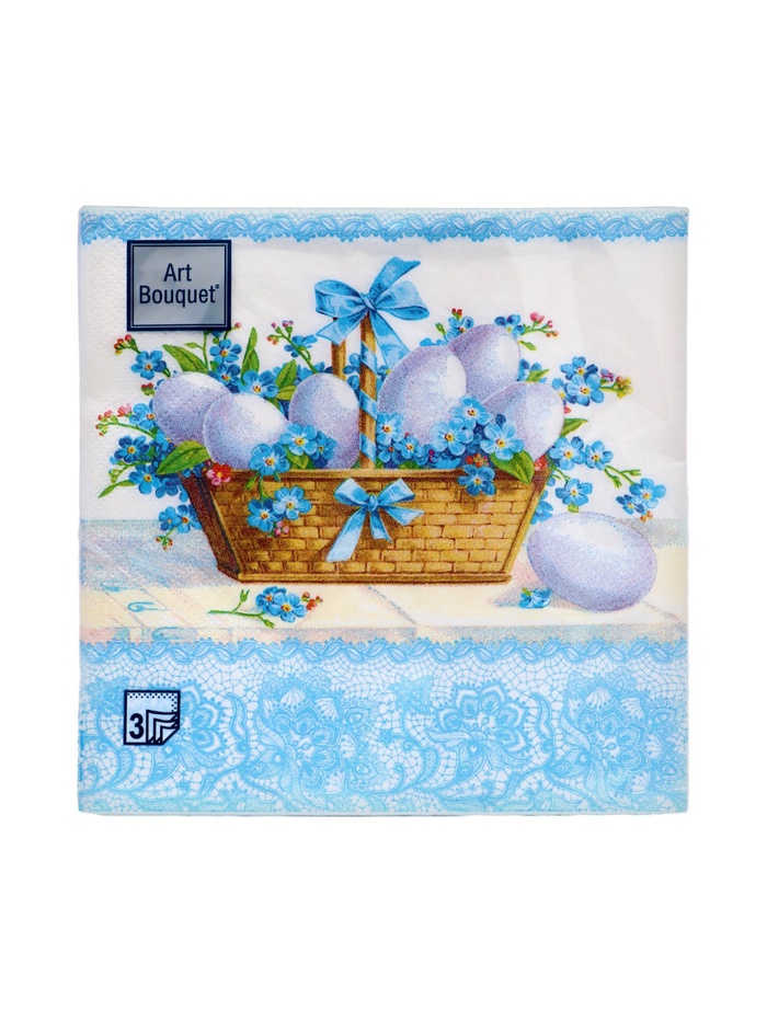 Пасхальные сервировочные бумажные салфетки Art Bouquet с рисунком «Пасхальная корзина» - это отличное украшение для вашего праздничного стола. Идеально подойдут как для сервировки, так и в качестве декора и украшения в домашних условиях или на больших мероприятиях. Праздничные салфетки с пасхальным рисунком будут хорошим подарком для родных и близких. Данные салфетки можно использовать так же для декупажа и коллажей.