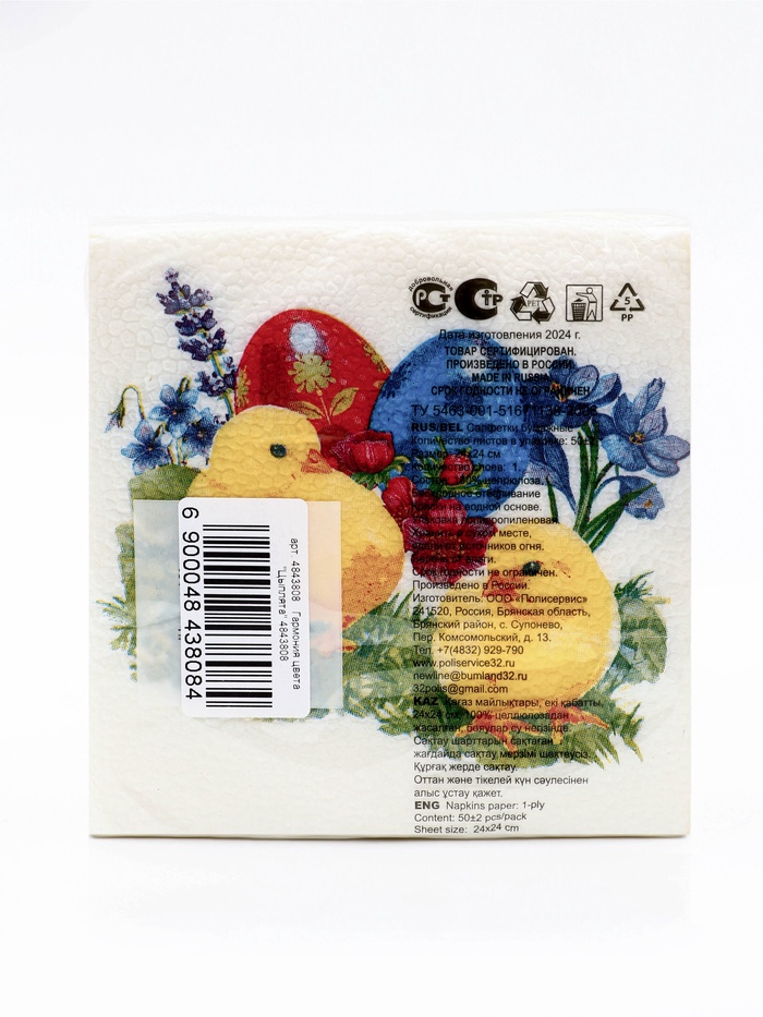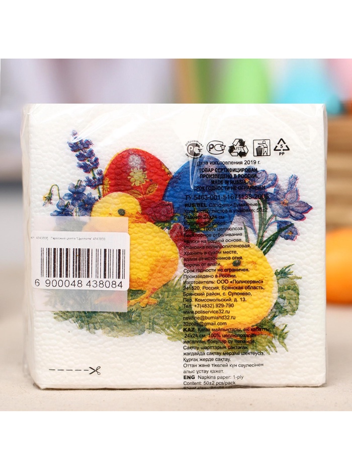 Пасхальные сервировочные бумажные салфетки Гармония цвета с рисунком «Цыплята» - это отличное украшение для вашего праздничного стола. Идеально подойдут как для сервировки, так и в качестве декора и украшения в домашних условиях или на больших мероприятиях. Праздничные салфетки с пасхальным рисунком будут хорошим подарком для родных и близких. Данные салфетки можно использовать так же для декупажа и коллажей.