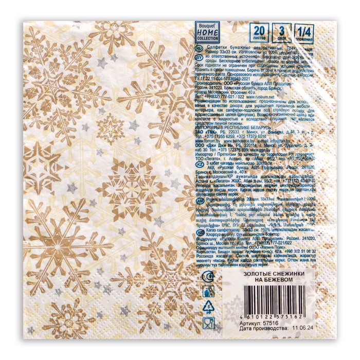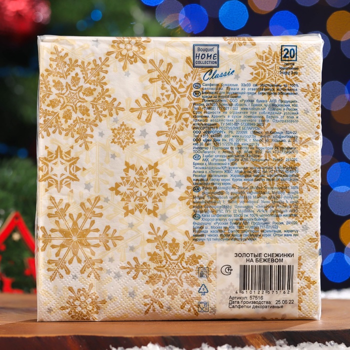 Салфетки новогодние бумажные Home Classic «Золотые снежинки на бежевом», 3 слоя, 33×33 см, 20 шт.