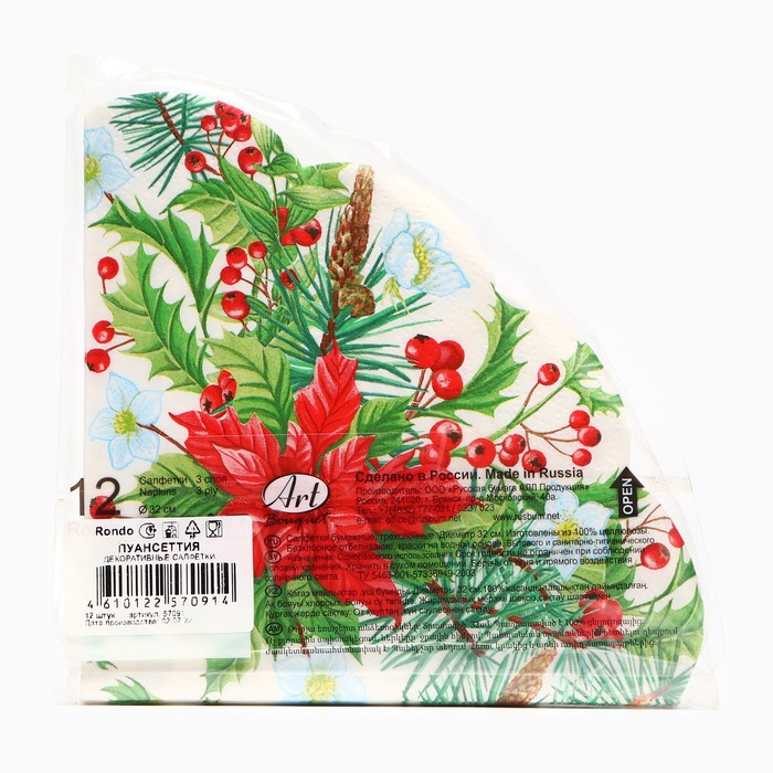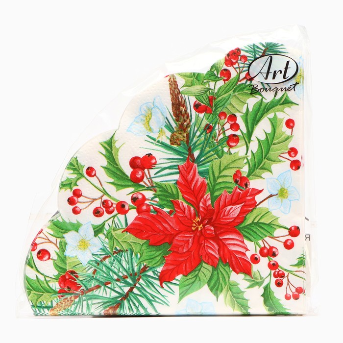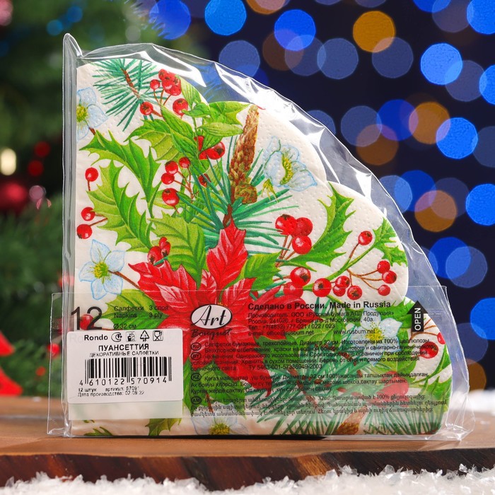 Салфетки новогодние бумажные круглые Art Bouquet Rondo «Пуансеттия», 3 слоя, d 32 см, 12 шт