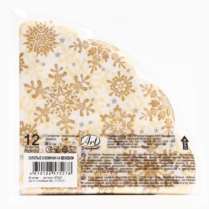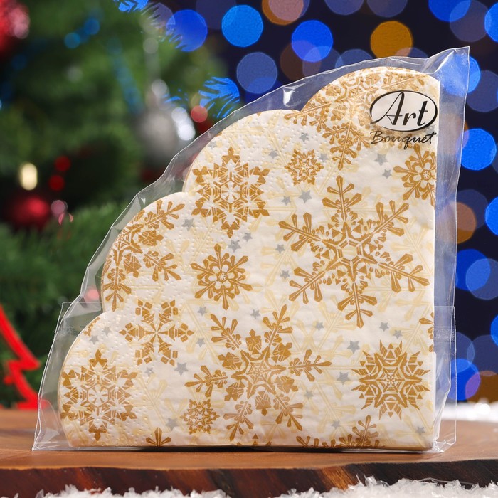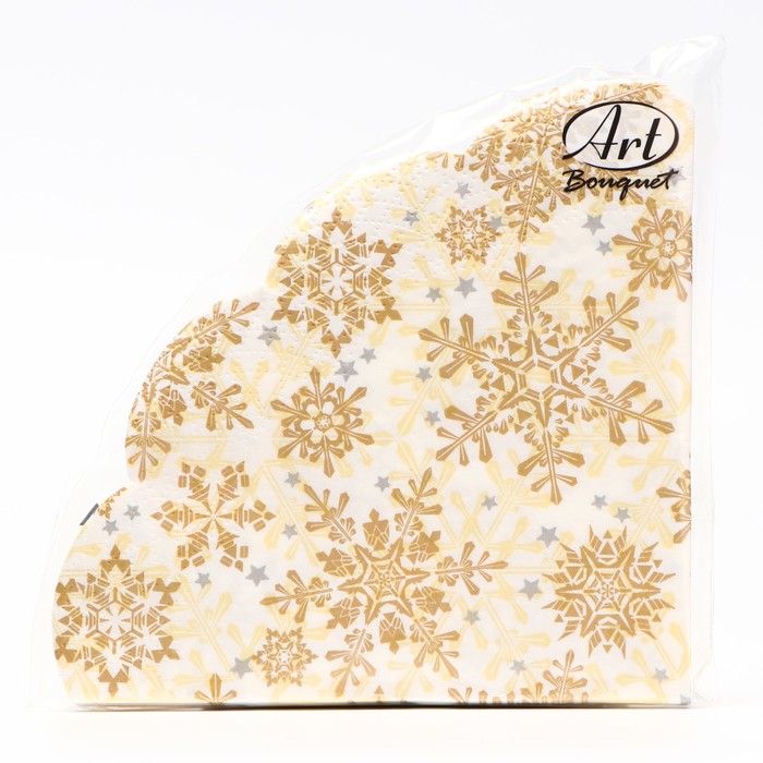 Салфетки новогодние бумажные круглые Art Bouquet Rondo «Золотые снежинки на бежевом», 3 слоя, d=32 см, 12 шт.