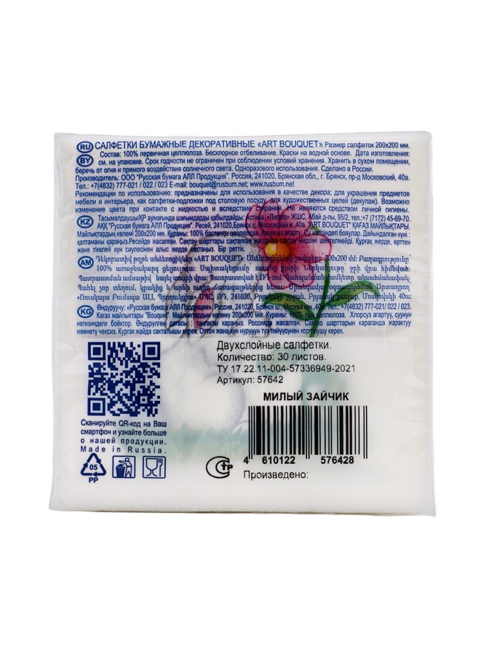 Салфетка состоит из 100% целлюлозы. Размер салфетки в развёрнутом виде 20х20 см, в сложенном виде 10х10 см.