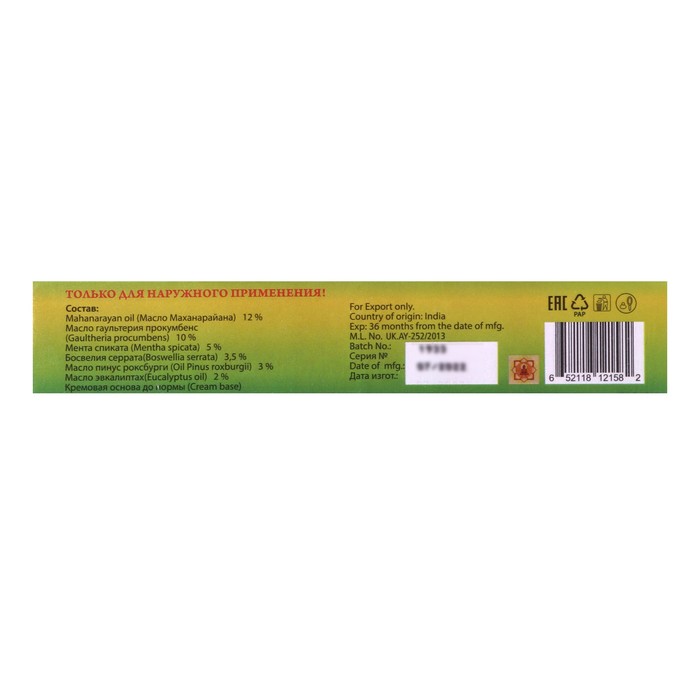Состав: аюрведический комплекс масел mahanarayan tailam, масло аультерия прокумбенс - 10 %, мента спиката - 5 %, босвелия серрата - 3,5 %, масло пинус роксбурги - 3 %, масло эвкалипта - 2 %, кремовая основа.