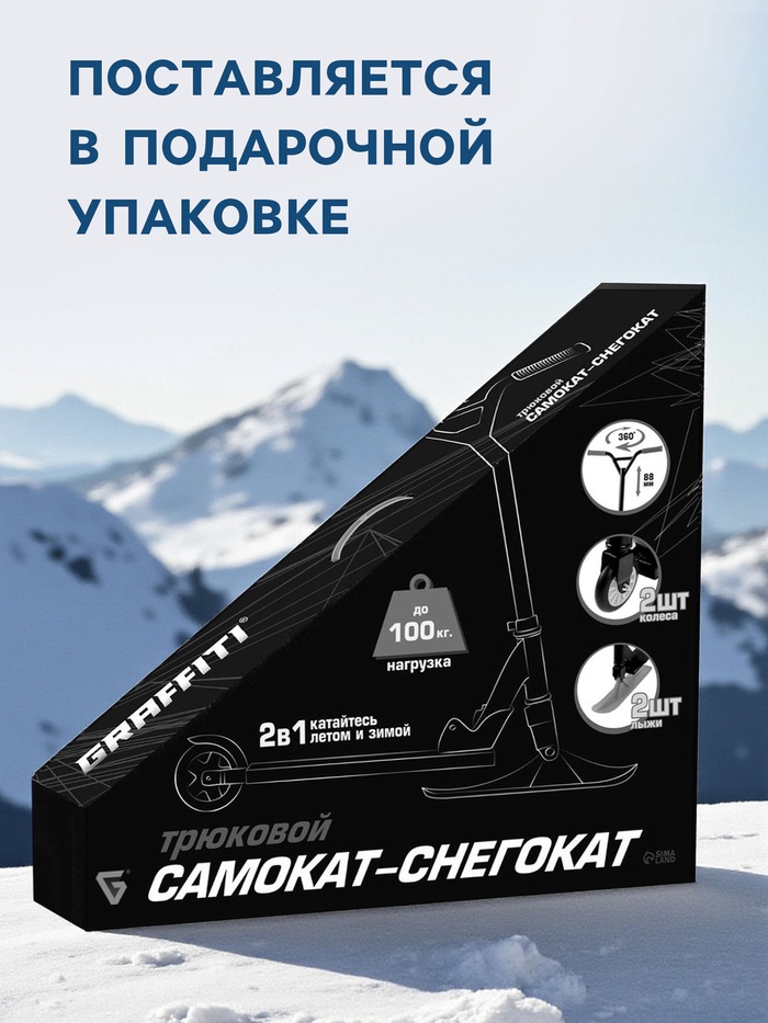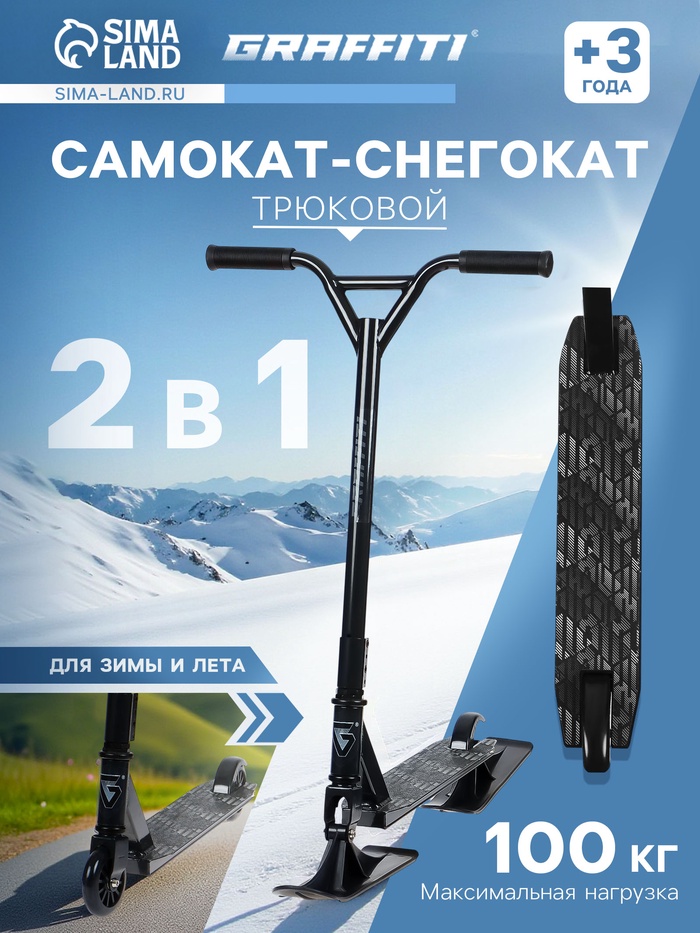 Детский самокат-снегокат — новая модель для летнего и зимнего активного отдыха. Конструкция представляет собой раму самоката, на которую устанавливаются лыжи или колёса. Трюковая рама выдерживает больший вес и более активную езду. Передняя лыжа управляется поворотом руля. Колёса можно установить в любой момент, для этого в комплекте есть всё необходимое.
