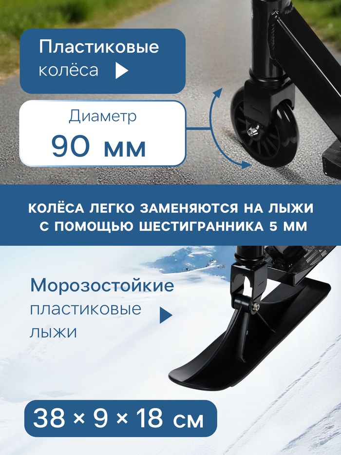 Самокат-снегокат актуален зимой и летом. На колёсах можно кататься по любым ровным поверхностям в сухое время года, зимой — на лыжах по снегу.