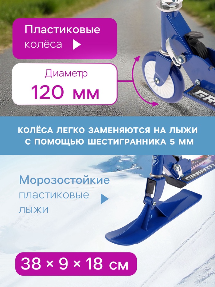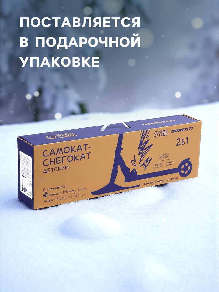 Самокат-снегокат актуален зимой и летом. На колёсах можно кататься по любым ровным поверхностям в сухое время года, зимой — на лыжах по снегу.