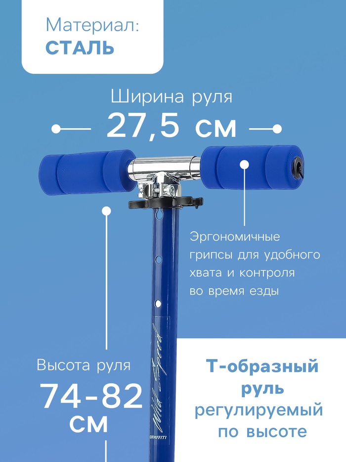 Рама складывается: рулевая стойка опускается к деке. В таком состоянии самокат занимает мало места. Платформа с шероховатым покрытием предотвращает скольжение ног. Высота руля регулируется и фиксируется в трёх положениях.