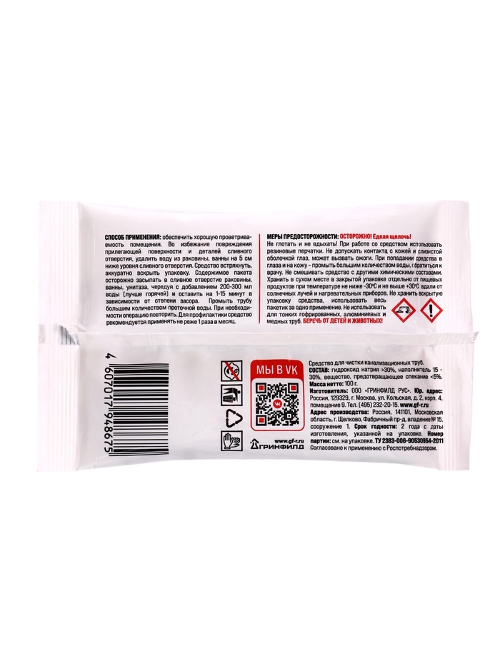 Формат 100 г — удобно для разовых применений и регулярной профилактики засоров.