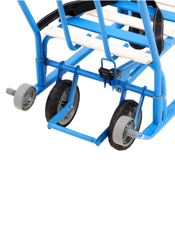- Металлический каркас и обрезиненные колёса выдерживают нагрузку до 25 кг. Сиденье из реек не прогибается и легко очищается от снега.