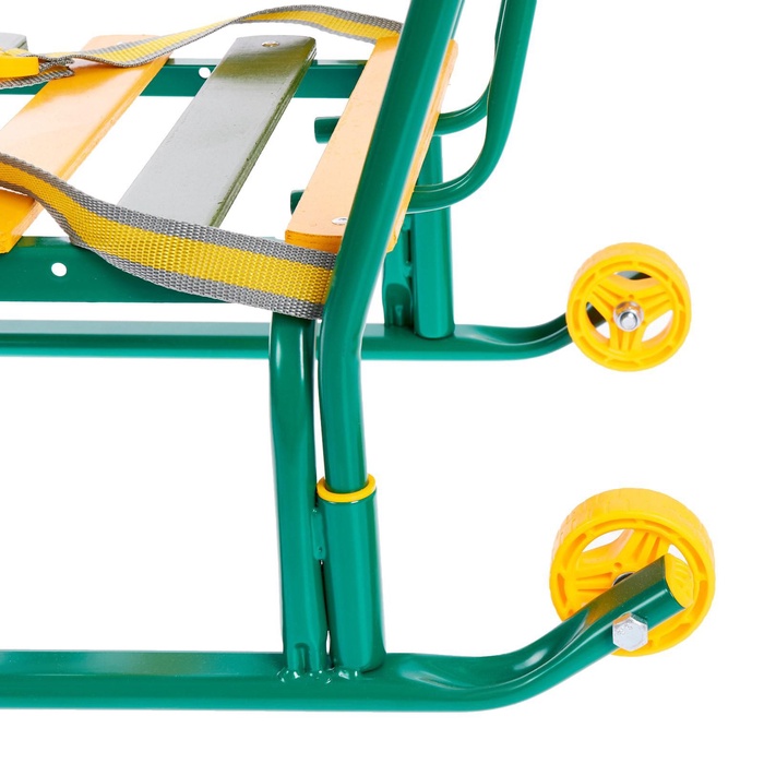 - Металлический каркас и морозостойкие пластиковые колёса выдерживают нагрузку до 25 кг. Сиденье из реек не прогибается и легко очищается от снега.