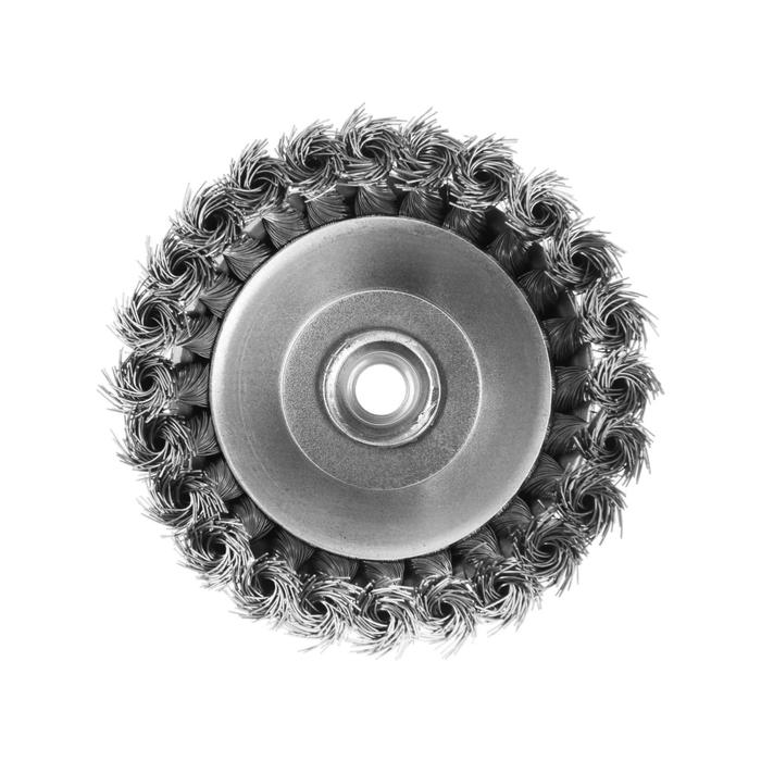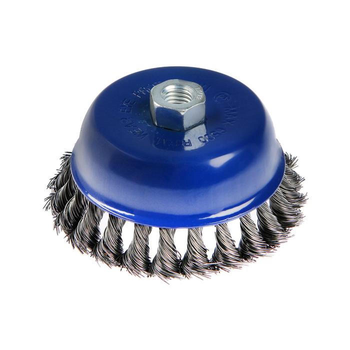 Металлическая кручёная щётка чашечного типа ТУНДРА предназначена для грубой зачистки металлических поверхностей от ржавчины и грязи, удаления неровностей и сглаживания сварных швов. Применяется совместно с угловой шлифовальной машиной, тип крепления - М14.