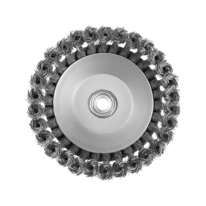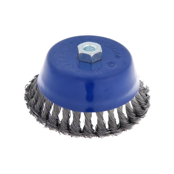 Металлическая кручёная щётка чашечного типа ТУНДРА предназначена для грубой зачистки металлических поверхностей от ржавчины и грязи, удаления неровностей и сглаживания сварных швов. Применяется совместно с угловой шлифовальной машиной, тип крепления - М14.