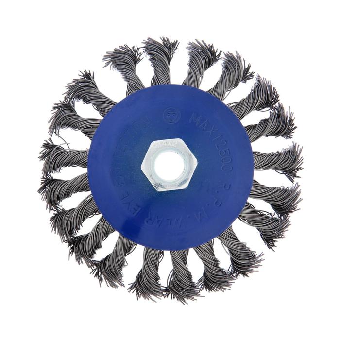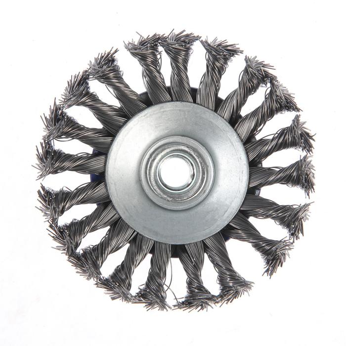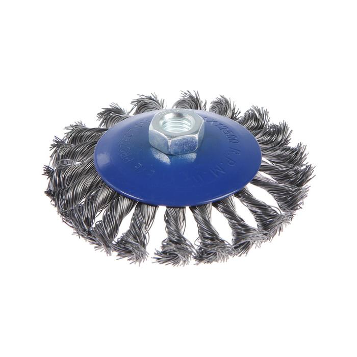 Металлическая кручёная щётка типа «тарелка» ТУНДРА предназначена для грубой зачистки изделий из различных материалов, удаления ржавчины и грязи с металлических поверхностей. Применяется совместно с угловой шлифовальной машиной, тип крепления - М14.