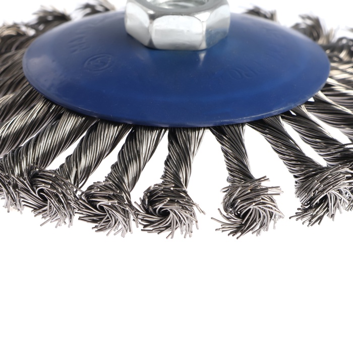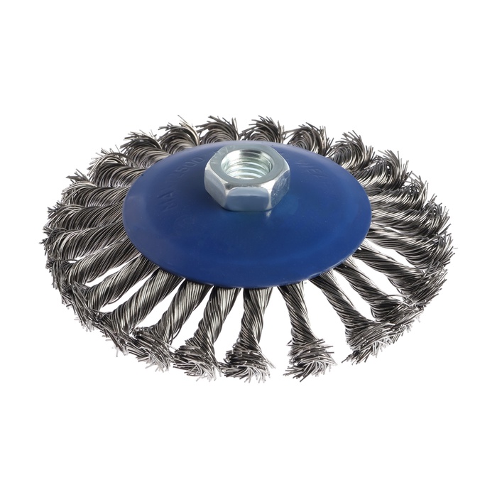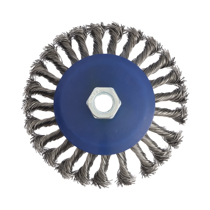 Металлическая кручёная щётка типа «тарелка» ТУНДРА предназначена для грубой зачистки изделий из различных материалов, удаления ржавчины и грязи с металлических поверхностей. Применяется совместно с угловой шлифовальной машиной, тип крепления - М14.