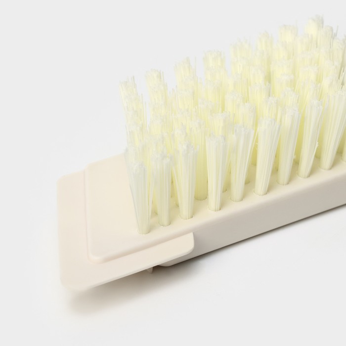 Щётка имеет цельную конструкцию с эргономичным корпусом, благодаря которому обеспечивается комфортное использование и простота в обращении.Размеры данного изделия составляют 14 сантиметров в длину, что позволяет использовать его для работы с различными поверхностями.Особенностью данной щётки является наличие скребка, расположенного на противоположном конце от щетины. Такой конструктивный элемент позволяет легко удалять стойкие и въевшиеся пятна, грязь и другие загрязнения.Щетина щётки изготовлена из качественного и прочного материала, который обеспечивает долговечность и надёжность изделия.Гибкость щетинок позволяет аккуратно удалять пыль и грязь, не повреждая обрабатываемую поверхность.Универсальная щётка-скребок подходит для использования как с сухими, так и влажными поверхностями, что делает её идеальным выбором для уборки на кухне, в ванной комнате и других помещениях.После использования щётку достаточно просто промыть под струёй воды, чтобы очистить её от загрязнений.Благодаря компактным размерам, эта щётка не займёт много места при хранении и всегда будет под рукой в нужный момент.