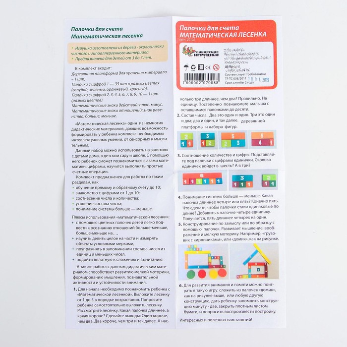 Палочки для счёта «Математическая лесенка» — это увлекательный и обучающий набор для детей от 3 лет. С его помощью дети могут изучать основы математики, развивая логическое мышление и мелкую моторику.