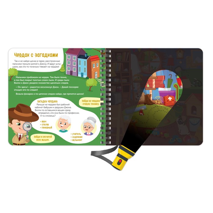 Для игры вам понадобится фонарик. Он выполнен из картона и привязан к книжке на шнурок.