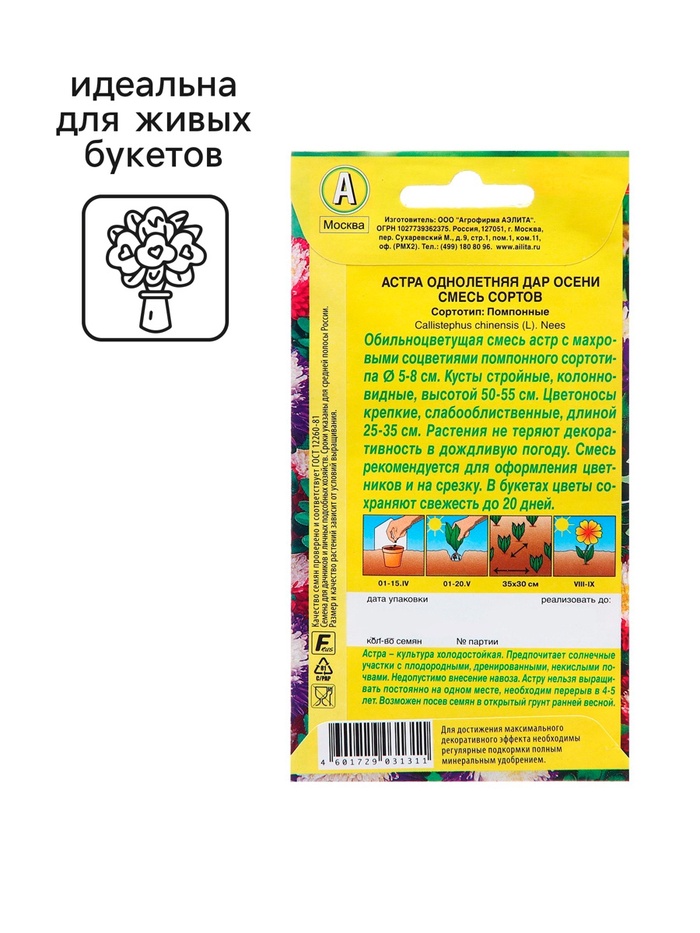 Кустовая, обильноцветущая астра с крупными махровыми соцветиями (7-9 см). Отличается ранним и продолжительным цветением с июля и до глубокой осени. Кустики плотные, высотой 50-55 см, с большим количеством крепких цветоносов. Растения устойчивы к пониженным температурам, воздействию дождя и ветра. Предпочитают солнечное местоположение. Отлично смотрятся на клумбах, в рабатках и высоких бордюрах. Хорошо подходят для срезки, соцветия долго не вянут в воде.
