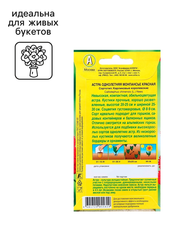 Невысокая компактная астра с необычайно обильным цветением. Густомахровые соцветия 6-7 см настолько плотно покрывают растения, что листвы почти не видно. Кусты прочные, хорошо разветвленные, высотой 15-20 см и шириной 25-30 см. Растения холодостойкие, хорошо переносят заморозки до -3...-4°С. Для выращиванияв горшках, садовых контейнерах и балконных ящиках, в бордюрах.