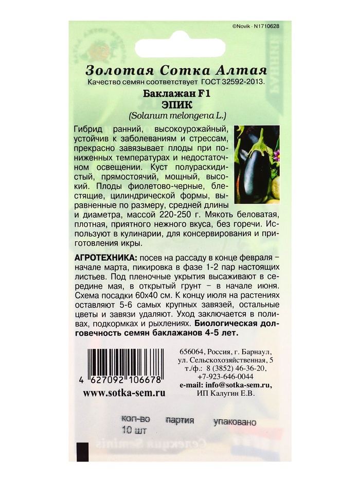 Семена Баклажан "Эпик F1", раннеспелый, 10 шт