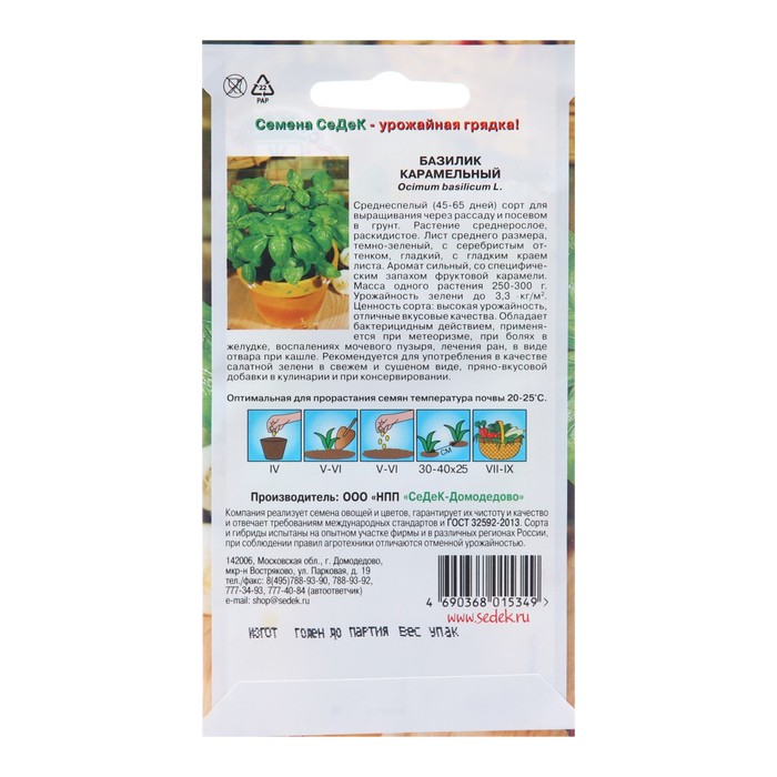 Среднеспелый (45-65 дней) сорт для выращивания через рассаду и посевом в грунт. Растение среднерослое, раскидистое. Лист среднего размера, темно-зеленый с серебристым оттенком, гладкий, с гладким краем листа. Аромат сильный, со специфическим запахом фруктовой карамели. Масса одного растения 250-300 г. Урожайность зелени до 3,3 кг/м2. Ценность сорта: высокая урожайность, отличные вкусовые качества. Обладает бактерицидным действием, применяется при метеоризме, при болях в желудке, воспалениях мочевого пузыря, лечения ран, в виде отвара при кашле. Рекомендуется для употребления в качестве салатной зелени в свежем и сушеном виде, пряно-вкусовой добавки в кулинарии и при консервировании.