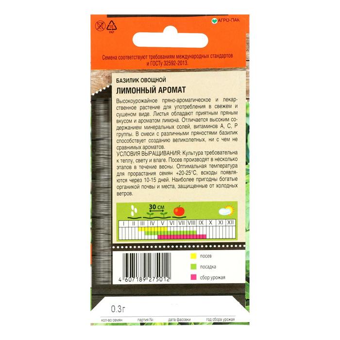 Среднепоздний (60-70 дней от всходов до технической спелости) сорт. Выращивается в рассадной и безрассадной культуре. Посев на рассаду конец марта – начале апреля. Высадка рассады в грунт в начале июня. Растение полупрямостоячее. Лист крупный, ярко-зеленый, гладкий. Стебель светло-зеленый, белесоватый. Масса растения 170-260 г. Аромат сильный, лимонного оттенка. Урожайность зелени 1,9-2,9 кг/м2. Ценность сорта: высокая урожайность, лимонный аромат. Базилик предпочитает хорошо структурированные, богатые гумусом почвы. Нуждается в регулярных поливах. Рекомендуется для использования в свежем виде в качестве салатной зелени, пряно-вкусовой добавки и натурального ароматизатора в кулинарии и при консервировании. Схема посадки 30х30см.