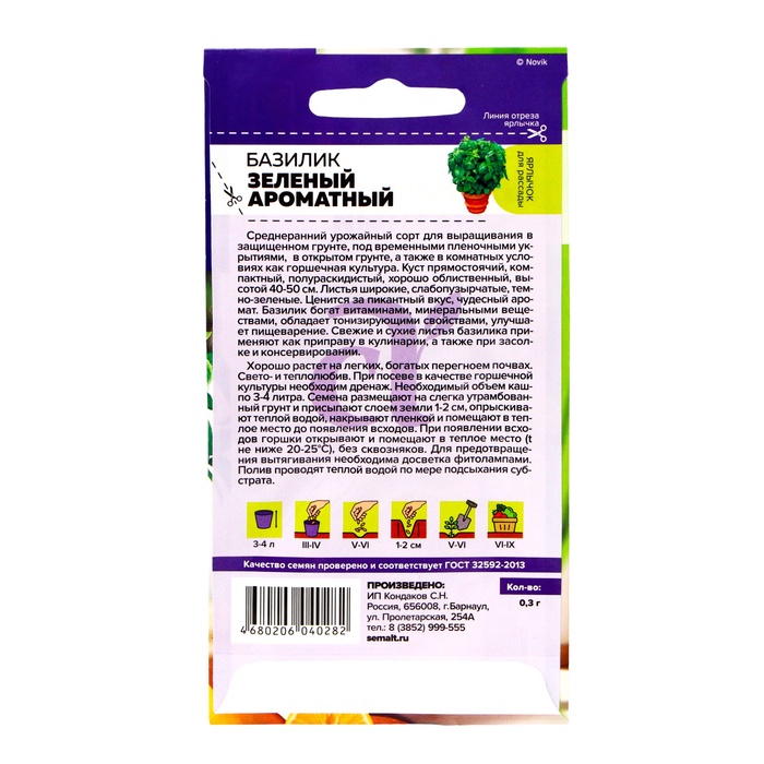 Среднеранний урожайный сорт для выращивания в защищенном грунте, под временными пленочными укрытиями, в открытом грунте, а также в комнатных условиях как горшечная культура. Куст прямостоячий, компактный, полураскидистый, хорошо облиственный, высотой 40-50 см. Листья широкие, слабопузырчатые, темно-зеленые. Ценится за пикантный вкус, чудесный аромат. Базилик богат витаминами, минеральными веществами, обладает тонизирующими свойствами, улучшает пищеварение. Свежие и сухие листья базилика применяют как приправу в кулинарии, а также при засолке и консервировании.