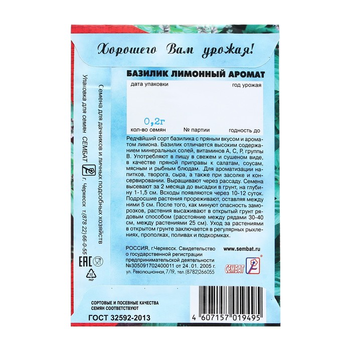 Раннеспелый сорт, период созревания – 55-60 дней. Растение полу-прямостоячее, высотой около 40 см. Лист среднего размера, светло-зеленого цвета, плоский. Все части растения обладают приятным цитрусовым ароматом, с нотками мелиссы и камфоры. Вкус также напоминает лимон, поэтому рекомендуем использовать листья в свежем виде, для блюд из рыбы, приготовления соуса «Песто», фруктовых салатов, десертов, для маринадов и компотов, а также для приготовления освежающих напитков. В сухом виде листья используют как пряность для блюд из овощей, мяса, рыбы, а также для ароматизации чаев в зимнее время.