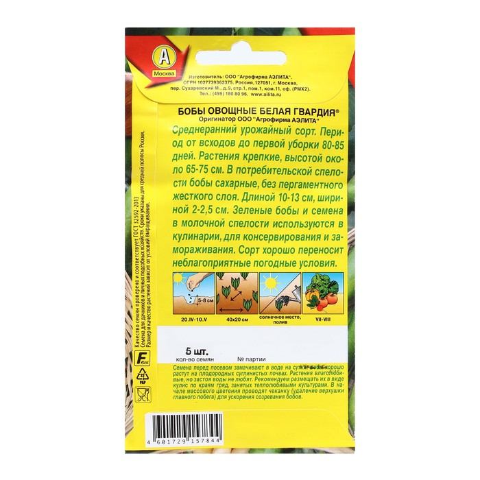 Среднеранний, урожайный сорт. От всходов до первой уборки бобов 70-85 дней. Растения высотой 85-105 см. В технической спелости бобы сахарные, без пергаментного слоя. Длина 10-13 см, ширина 2-2,5 см. Зеленые бобы и семена в молочной спелости используются в кулинарии, для консервирования и замораживания. Урожайность бобов 0,6- 0,8 кг/м 2 , семян 0,2-0,3 кг. Сорт хорошо переносит неблагоприятные погодные условия.